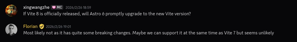 有人可能会疑惑,那 vite 8 支持呢?毕竟 vite 8 要呼之欲出了,我也有这个疑惑,所以很久之前我就在 Discord 上问过,看来即使 vite 8 正式推出,astro 6 也很难启用 vite 8