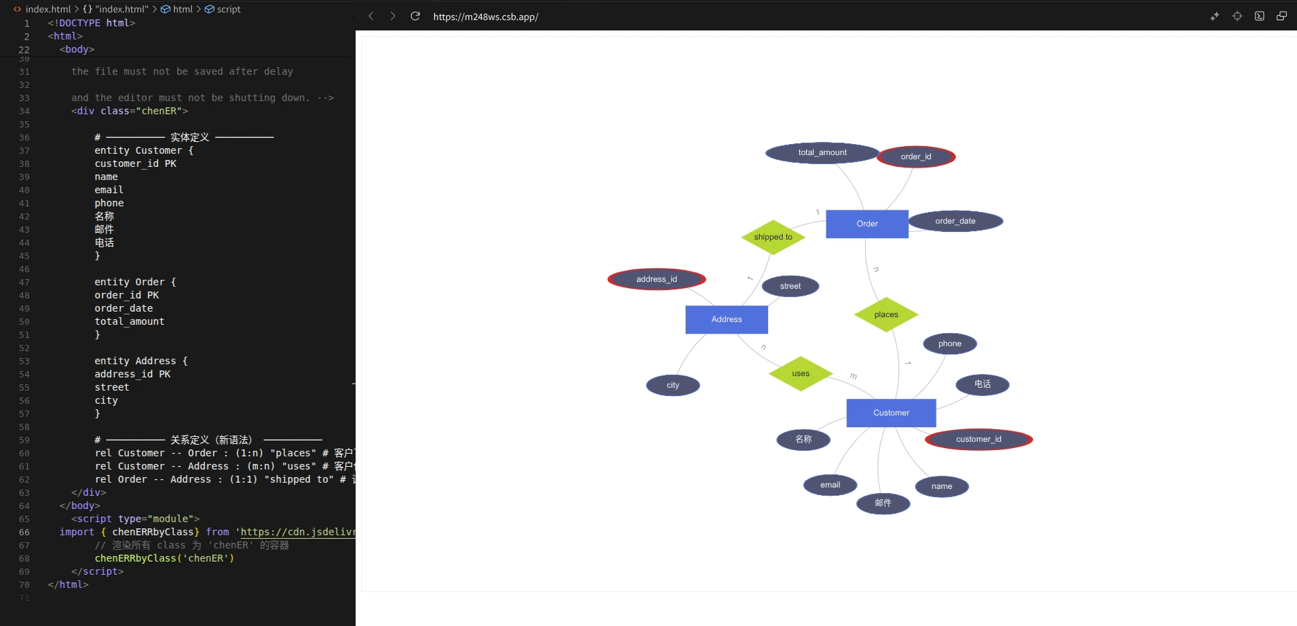 rel Customer -- Order (1:n) "places" # 客户下订单rel Customer -- Address (m:n) "uses" # 客户使用地址rel Order -- Address (1:1) "shipped to" # 订单发货地址相应的代码实现
