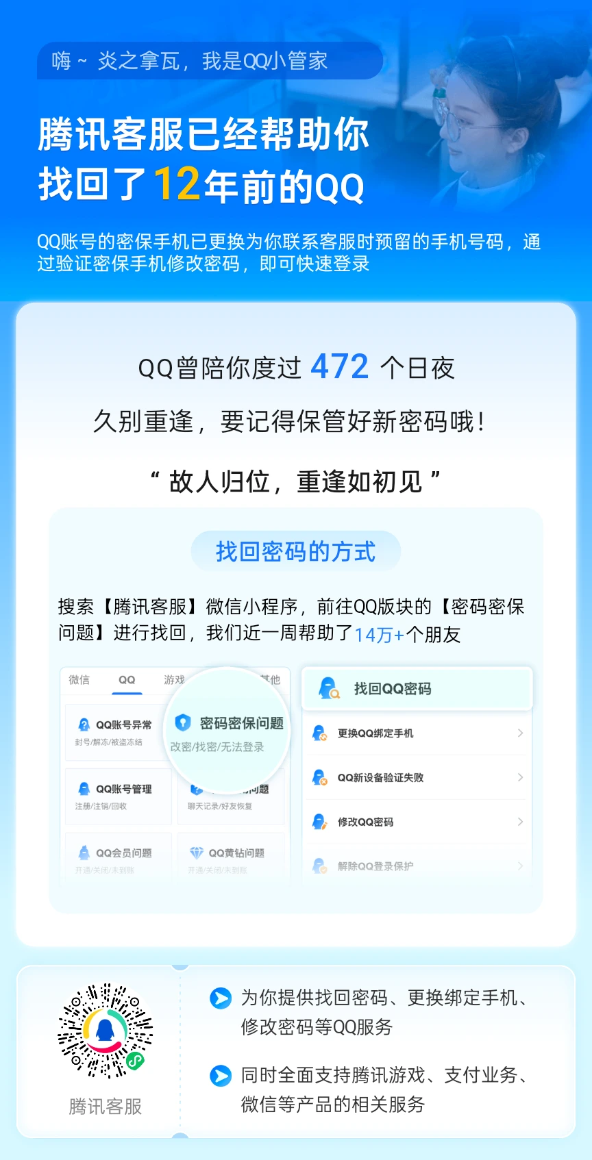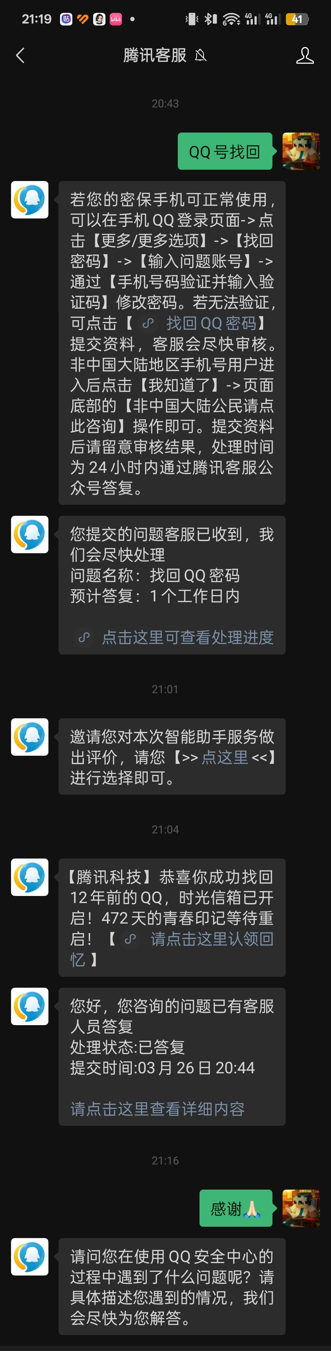 说来也神奇,我只记得 QQ号,甚至不记得这个 QQ 号更多的详细资料。在和微信里的 腾讯客服 联系之后,客服让我填写了 QQ号 和我当前使用的 手机号,20分钟后,我收到消息—— 12年前 的账号找回来了。